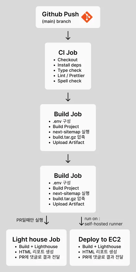 개발 블로그를 운영하면서 직접 배포 작업을 반복하는 것이 비효율적이라 판단되어, GitHub Actions를 이용해 자동 배포 파이프라인을 구성하게 되었습니다. CI/CD 파이프라인은 크게 코드 검사, 프로젝트 빌드, Lighthouse 성능 측정, EC2 서버 배포의 4단계로 나뉘며, main 브랜치에 푸시되었을 때 자동으로 실행되도록 설정되어 있습니다.