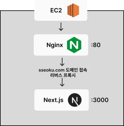 외부에서는 sseoku.com 도메인으로 접속하면, AWS EC2 인스턴스 위에서 동작하는 Nginx가 요청을 받고, 이를 Next.js 앱으로 리버스 프록시하는 형태입니다.